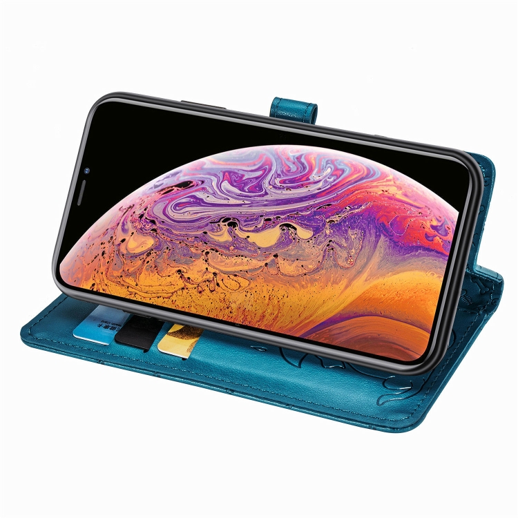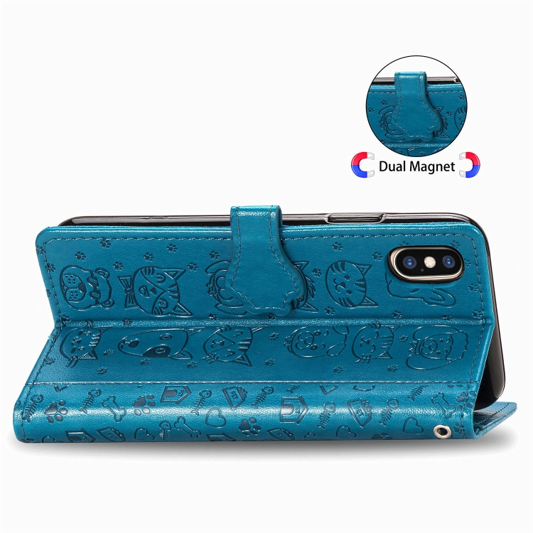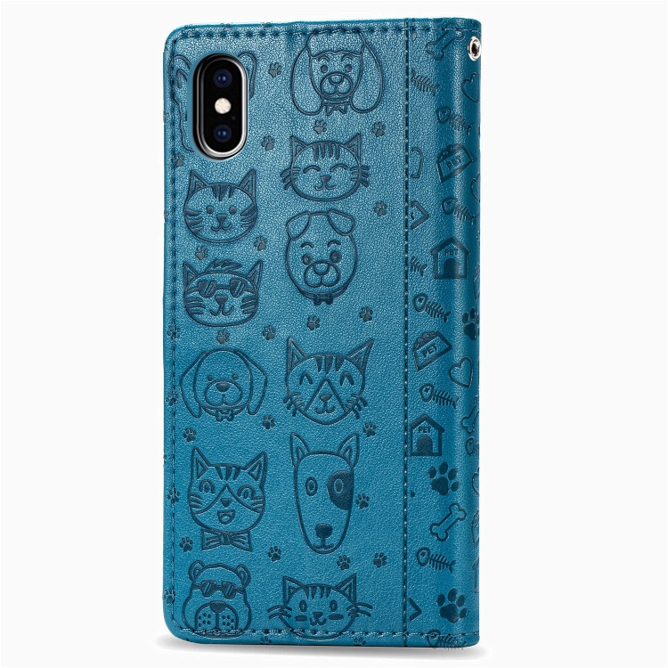 Estuche de Cuero de Pu para iPhone X / Xs con Tapa Horizontal en Relieve Gato y Perro Soporte Ranura Tarjeta Cartera Cordón (Azul)