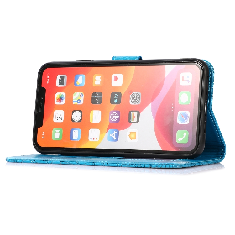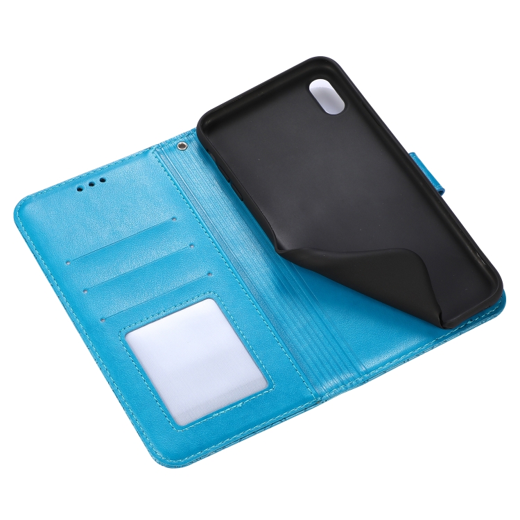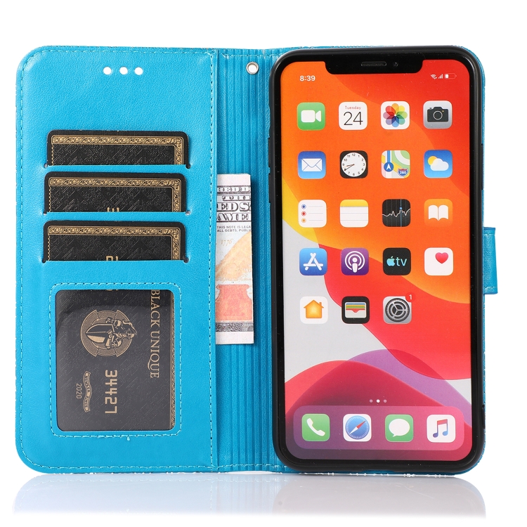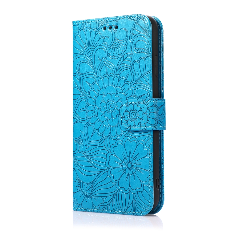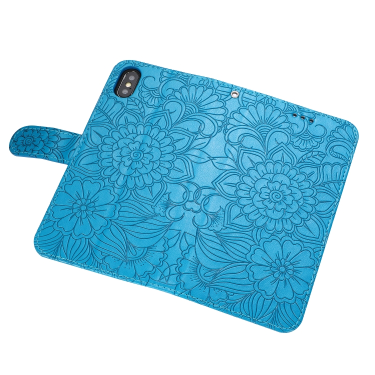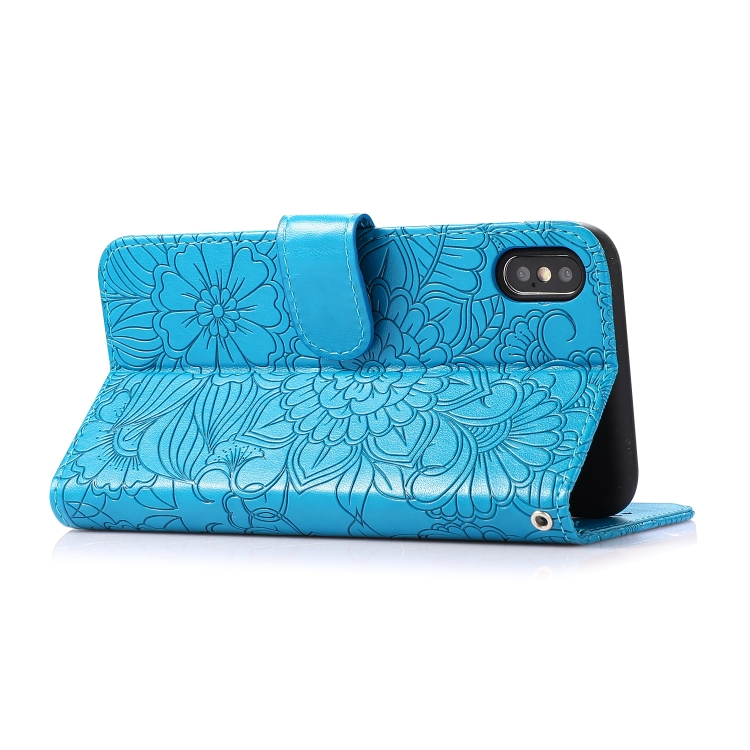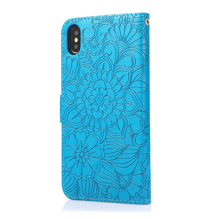 Funda para iPhone X / Xs Cuero con Tapa Horizontal Girasol en Relieve Soporte Ranuras Tarjetas Billetera Cordón (Azul)