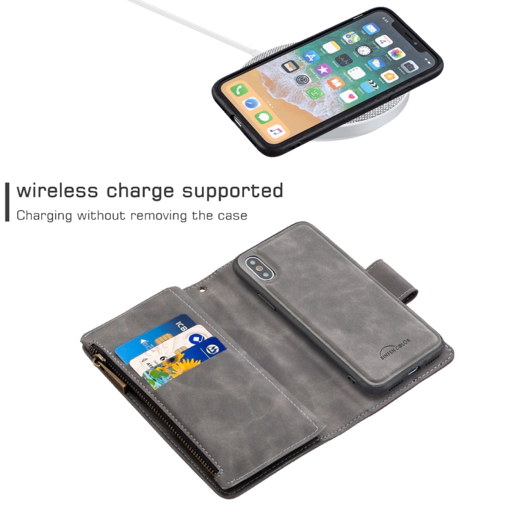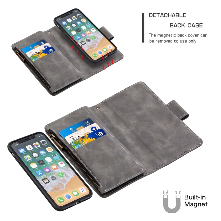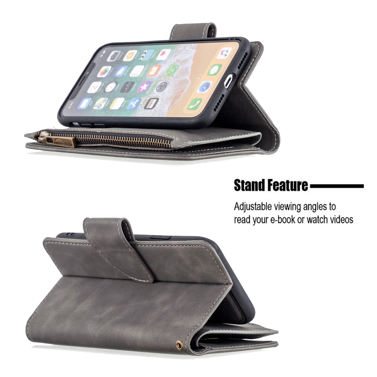 Funda para iPhone X Xs Cuero PU Cremallera Magnética Tapa Horizontal Ranuras Tarjetas Soporte Billetera Marco Fotos Cordón (Gris)