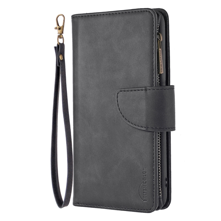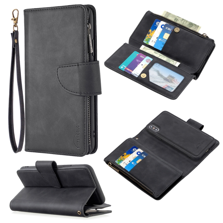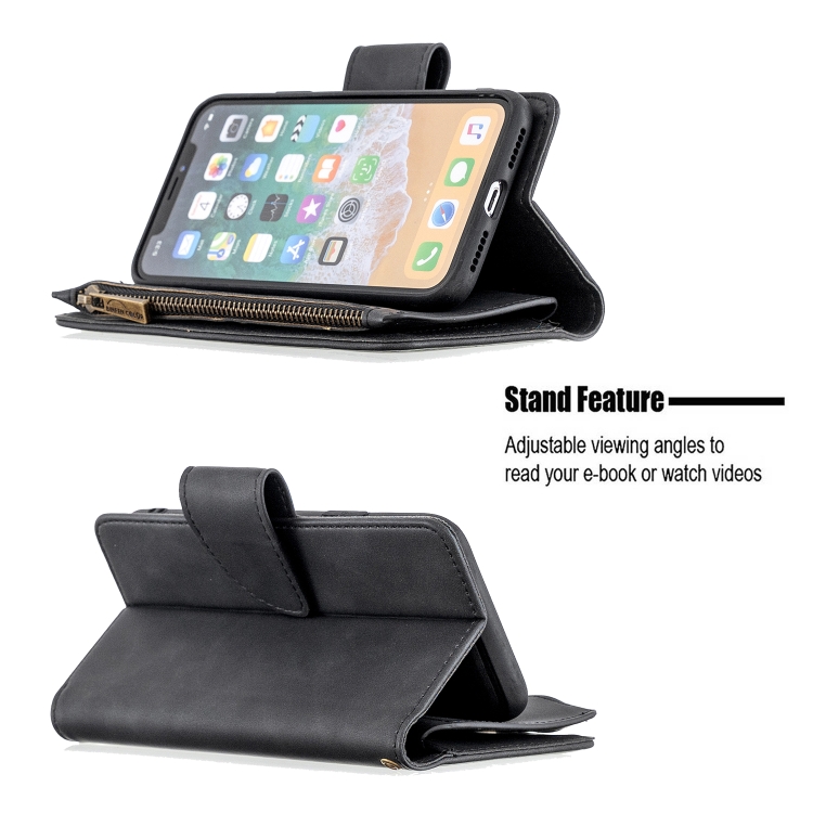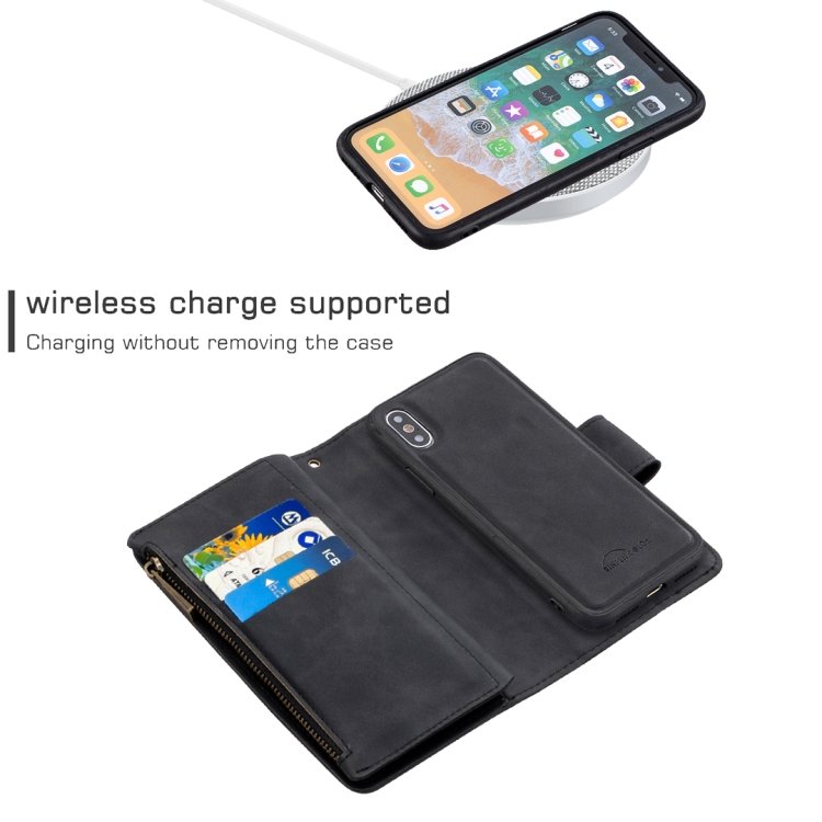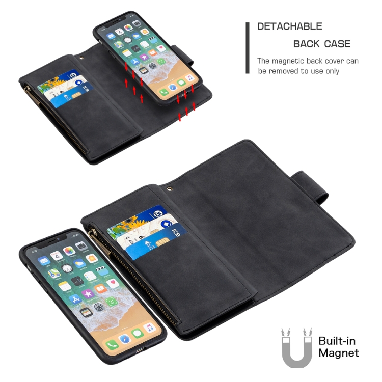 Funda para iPhone X Xs Cuero de Pu Desmontable Cremallera Magnética Tapa Horizontal Ranuras Tarjetas Soporte Billetera Marco Fotos Cordón (Negro)