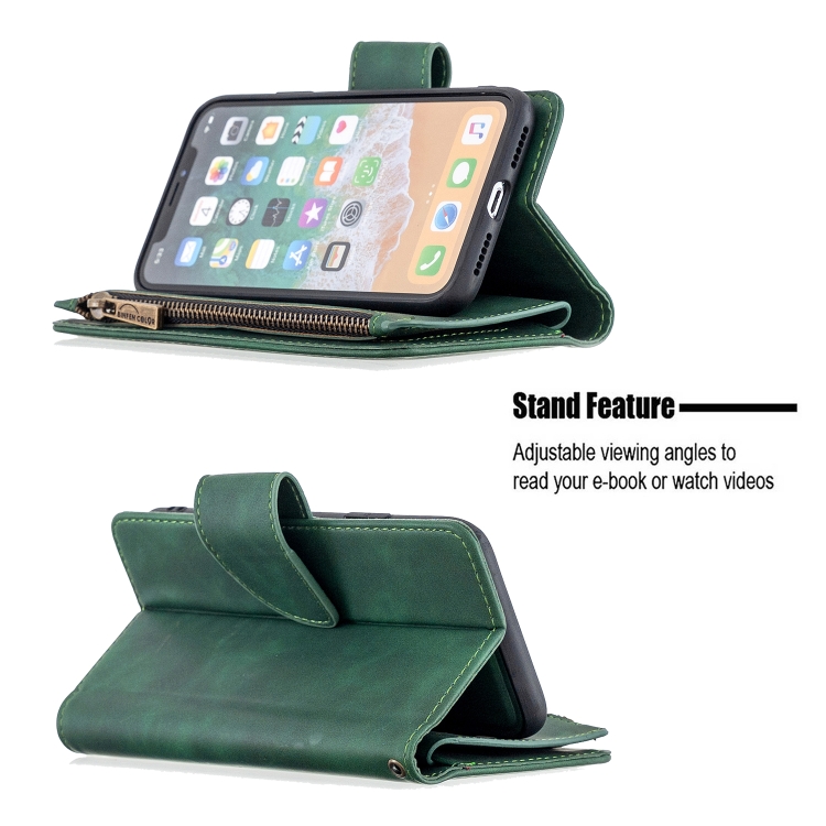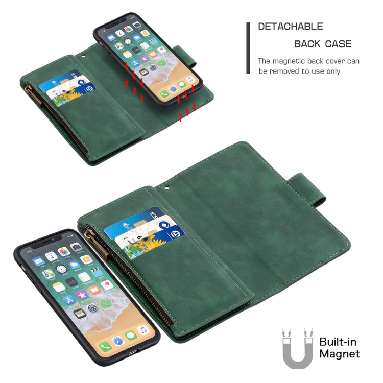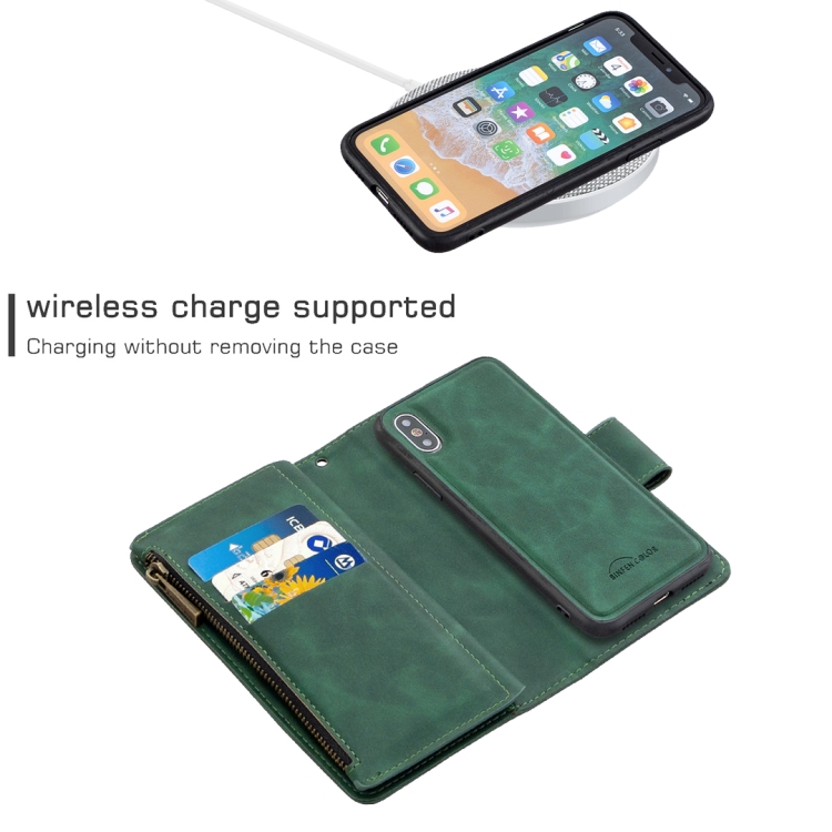 Funda para iPhone X Xs Cuero de PU Cremallera Magnética Tapa Horizontal Ranuras Tarjetas Soporte Billetera Marco Fotos Cordón (Verde)