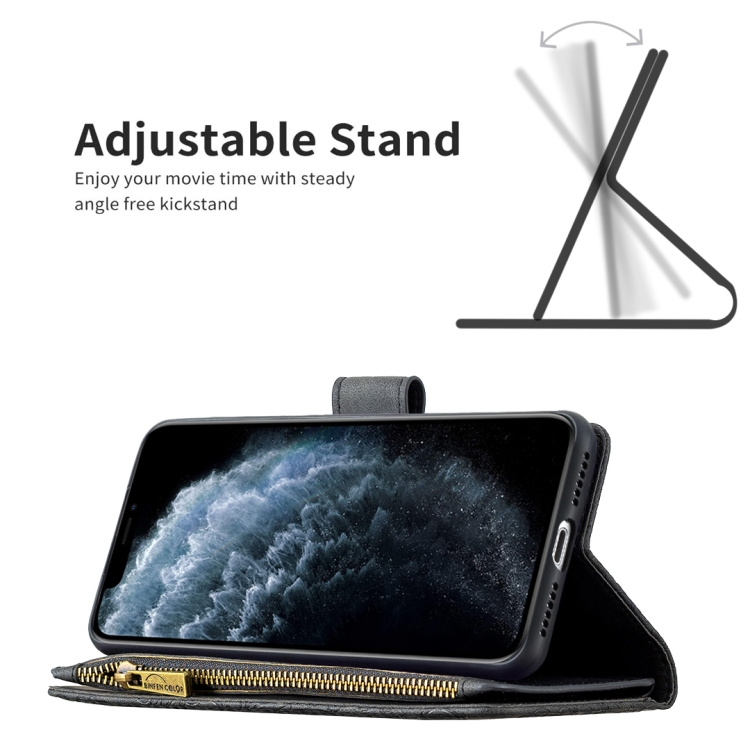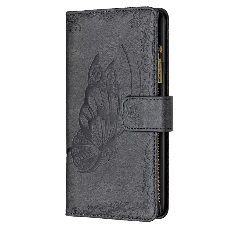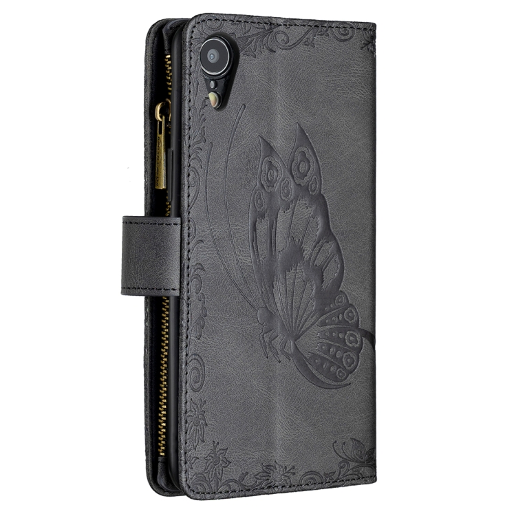 Funda de Cuero para iPhone Xr Flying Butterfly Patrón de Relieve con Cremallera Soporte Tragamonedas y Billetera (Negro)