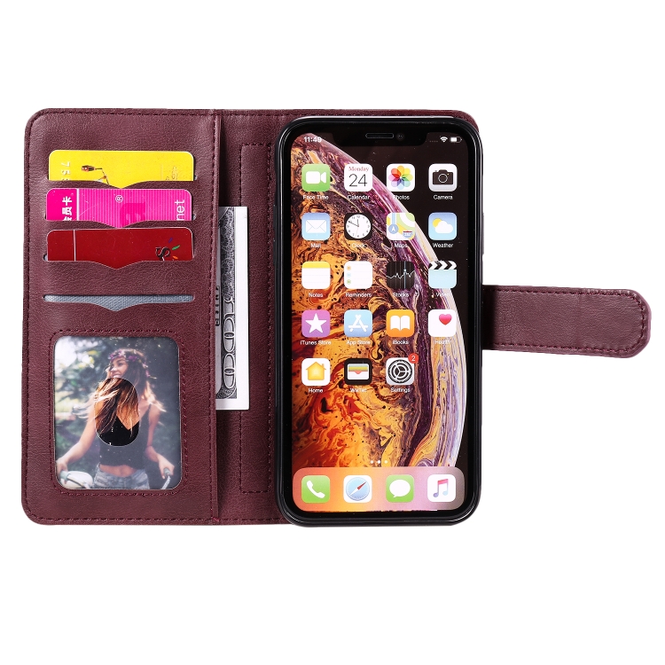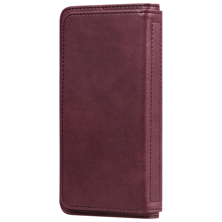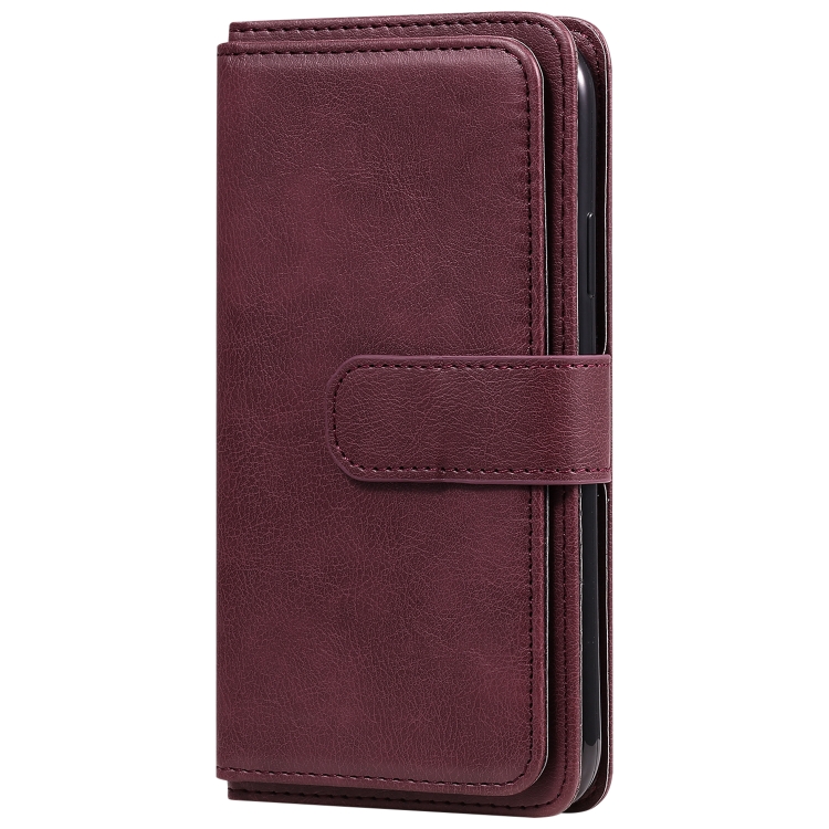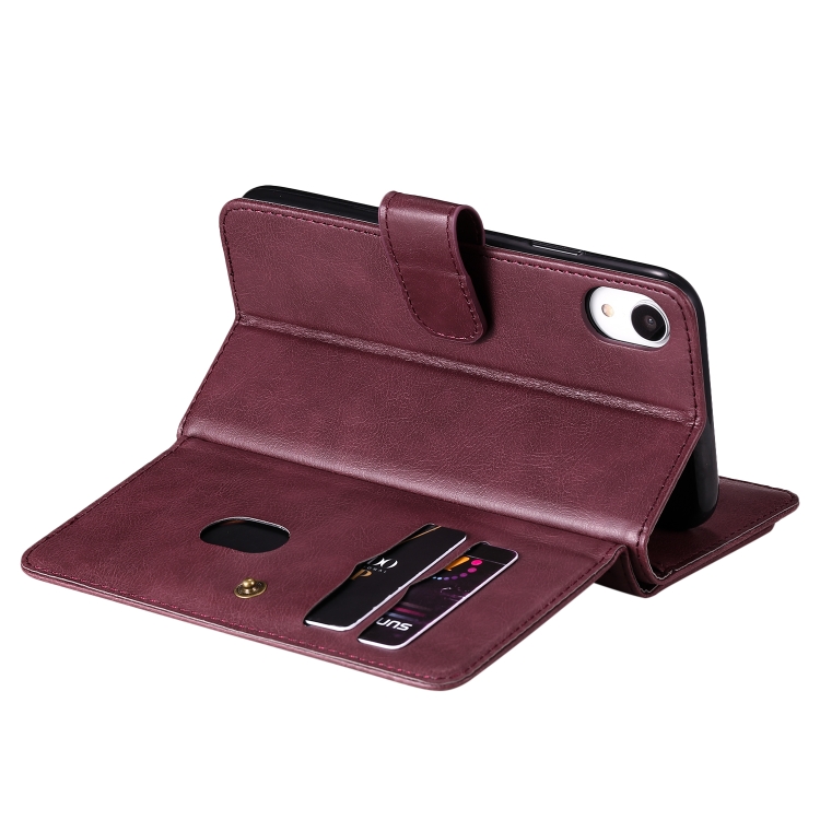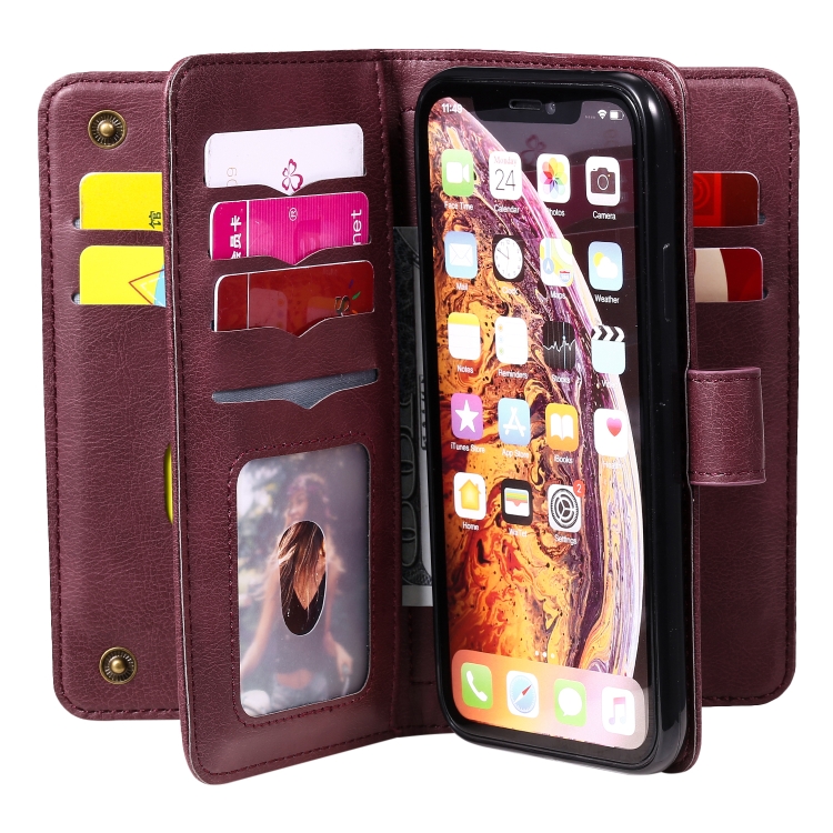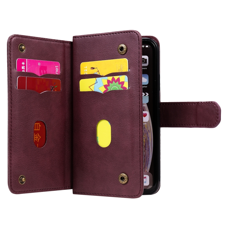 Funda para iPhone Xr Hebilla de Cobre Multifuncional Cuero Tapa Horizontal 10 Ranuras (Rojo Vino)