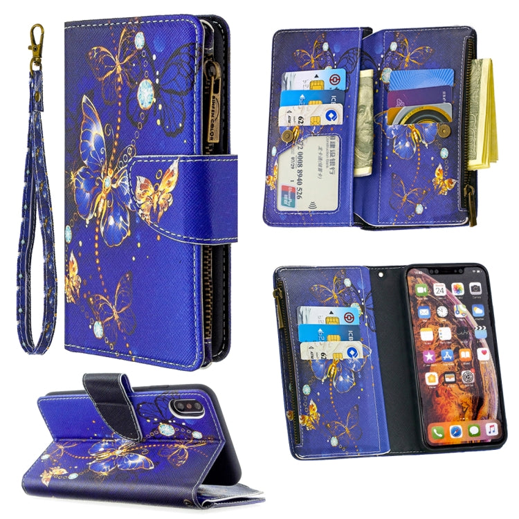 Funda de Cuero para iPhone Xs Max Patrón Dibujo Cremallera Tapa Horizontal Soporte Ranuras Tarjetas Billetera (Mariposa Púrpura)
