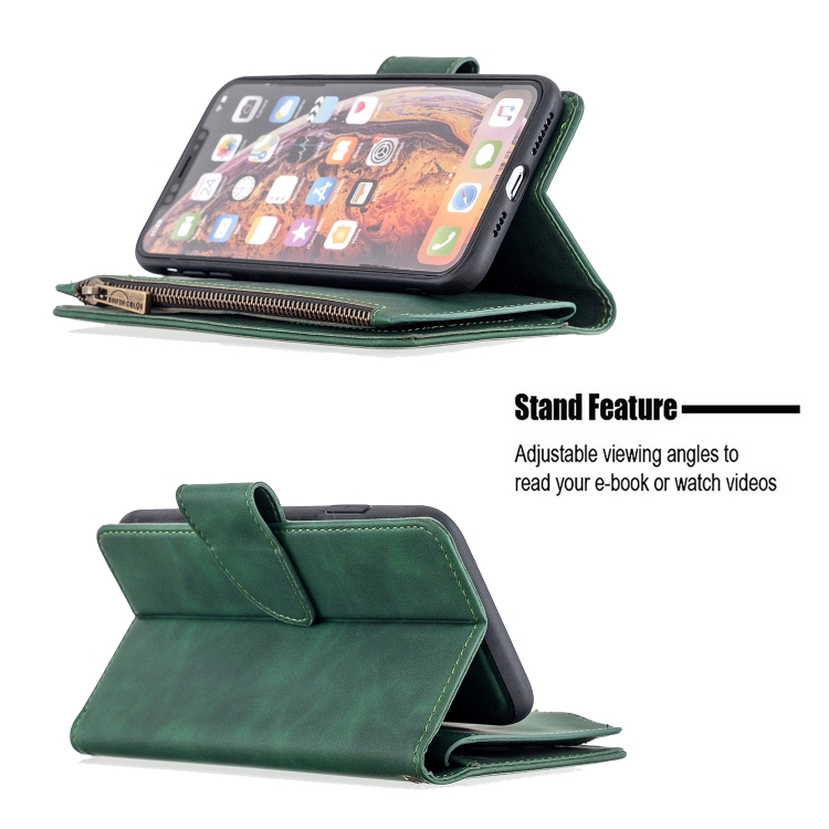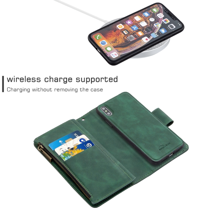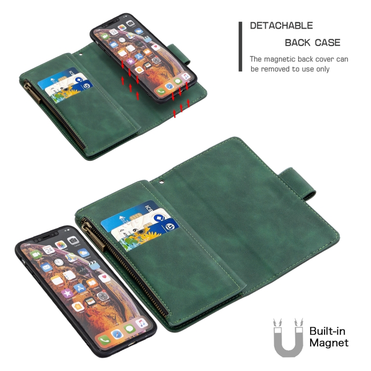 Funda para iPhone Xs Max Skin Feel Desmontable Cremallera Magnética Cuero PU Tapa Horizontal Ranuras Tarjetas Soporte Billetera Marco Fotos Cordón (Verde)