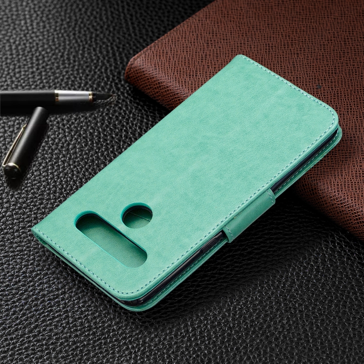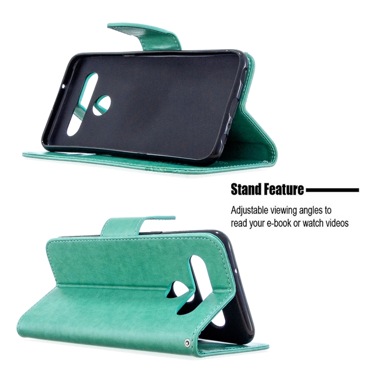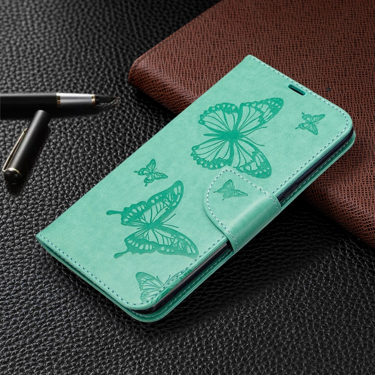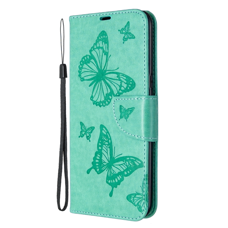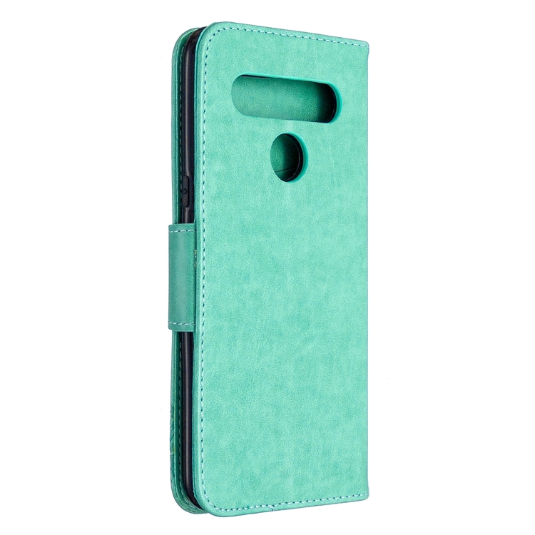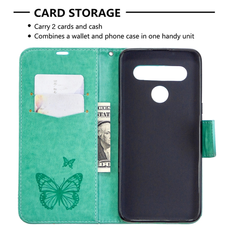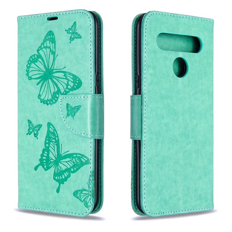 Funda de Cuero para LG K61 con Dos Mariposas en Relieve, Tapa Horizontal, Soporte, Ranura para Tarjeta y Billetera (Verde)