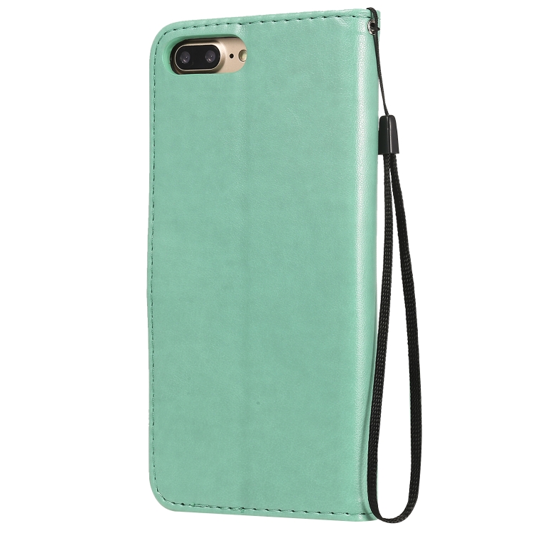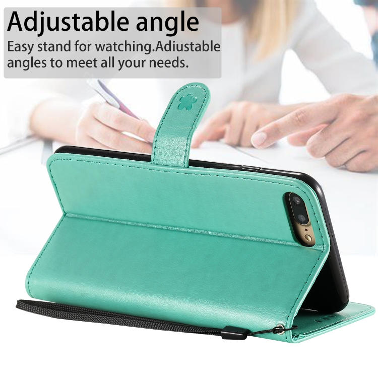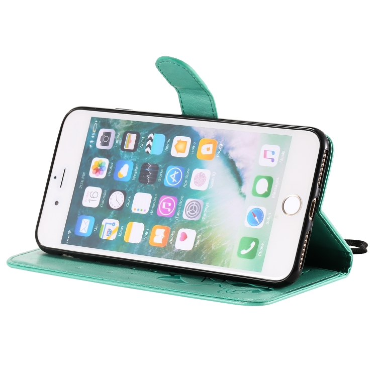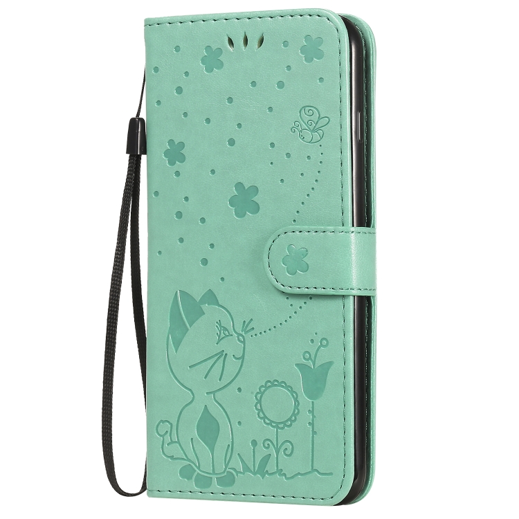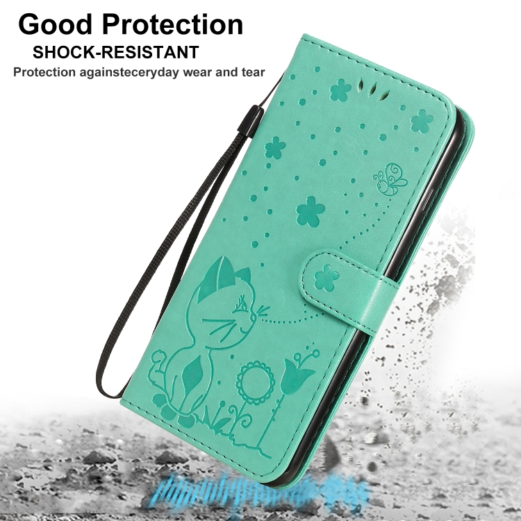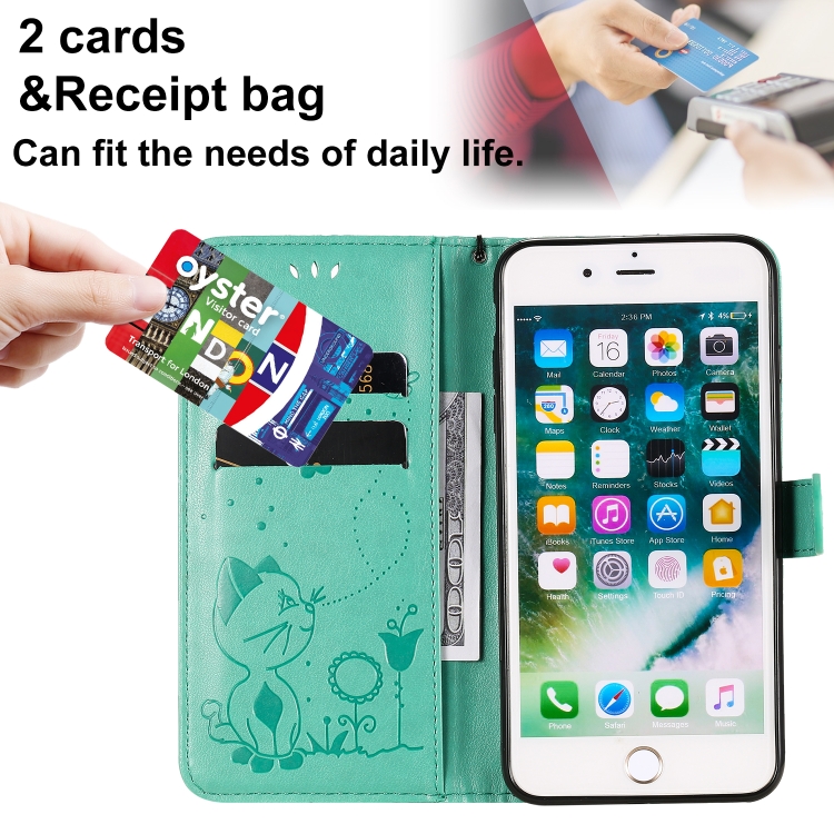 Funda para iPhone 8 Plus Patrón Gato Abeja Grabado en Relieve Cuero Tirón a Prueba de Golpes Horizontal con Ranuras y Sostenedor (Verde)