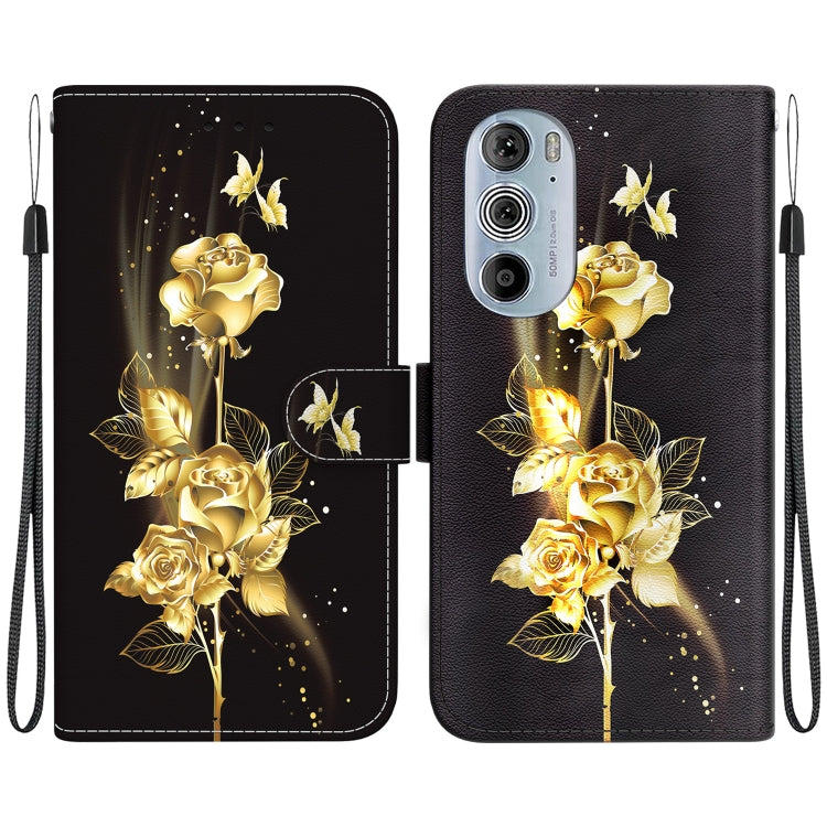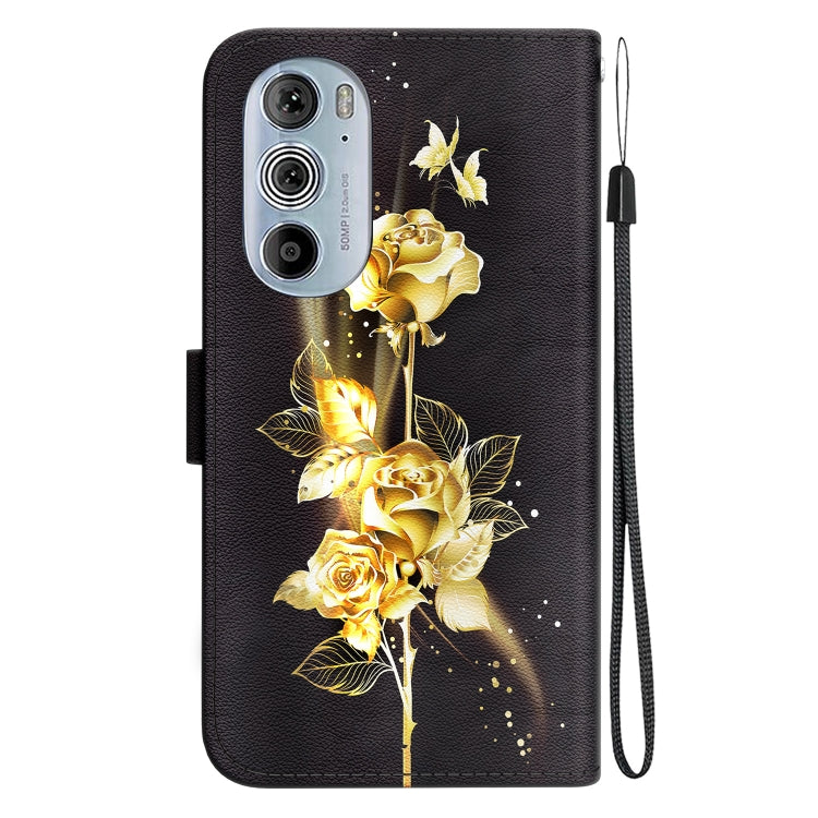 Estuche de Cuero para Motorola Edge+ (2022) con Dibujo Coloreado y Textura de Cristal (Mariposa Dorada Rosa)