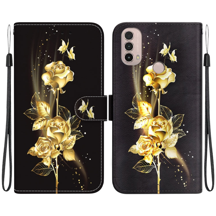 Funda para Motorola Moto E20 E30 E40 de Cuero con Dibujo y Textura de Cristal (Mariposa Dorada Rosa)