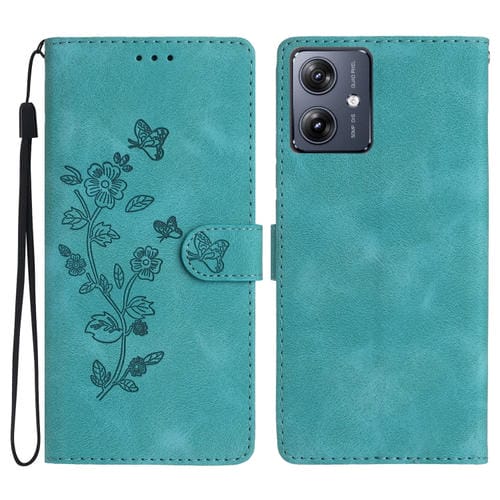 Funda de Cuero para Motorola Moto G14 4G con Estampado de Mariposa y Flor (Azul Cielo)