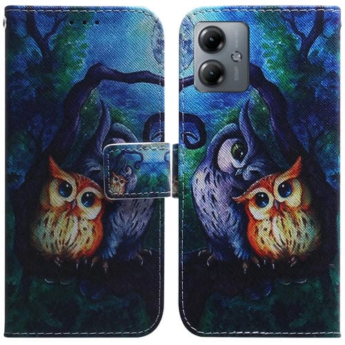 - 1x Funda de Cuero para Motorola Moto G14 con Tapa y Dibujo Búho de Pintura al Óleo