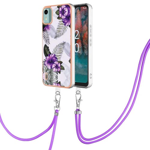 Estuche para Teléfono Nokia C12 Imd TPU con Galvanoplastia y Cordón (Flor Púrpura)