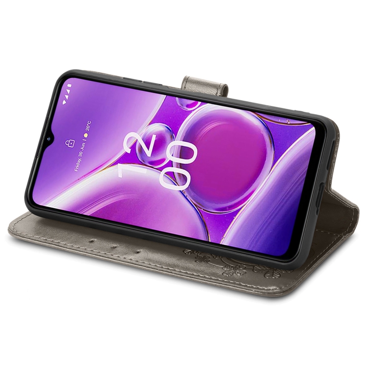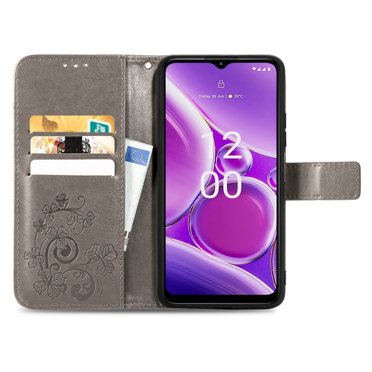 Funda para Nokia G42 de Cuero con Hebilla en Relieve y Cierre de Cuatro Hojas (Gris)