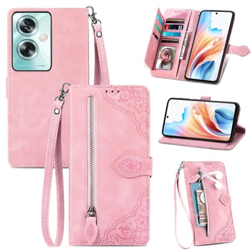 Para Oppo A79 5G / A2 5G Funda de Cuero con Cremallera y Flores En Relieve para Teléfono (Rosa)