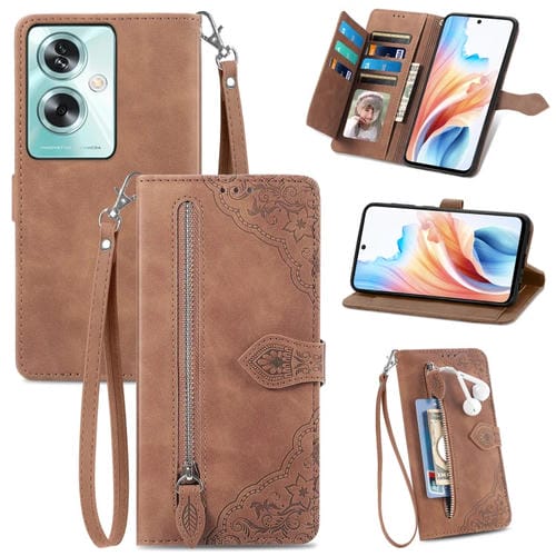 Para Oppo A79 5G / A2 5G Funda de Cuero para Teléfono con Cremallera y Flores En Relieve (Marrón)