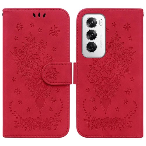Para Oppo Reno12 5G Global Butterfly Rose Funda de Cuero para Teléfono En Relieve (Rojo)
