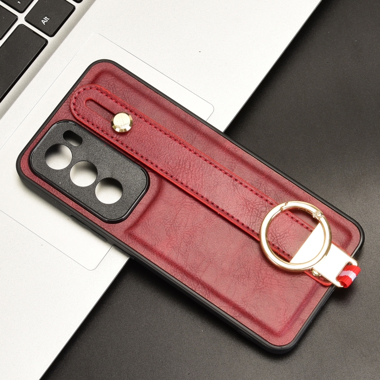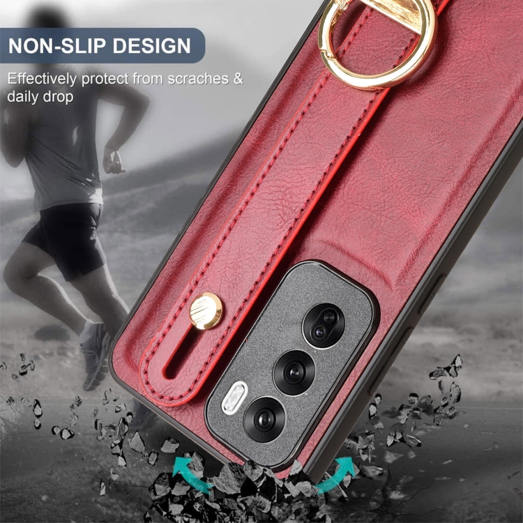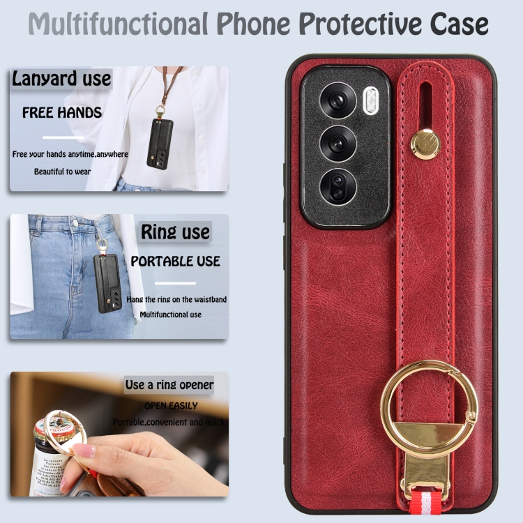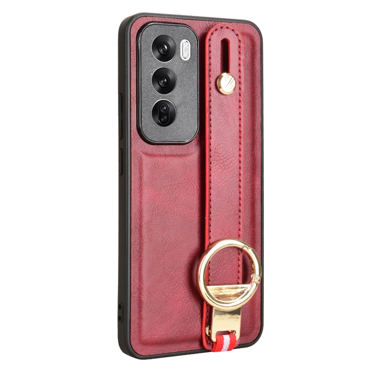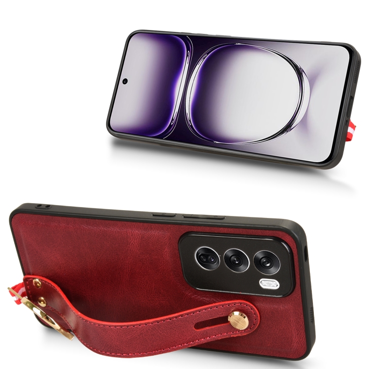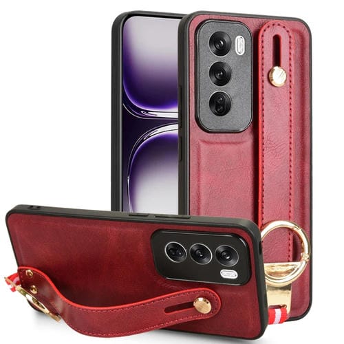 Para Oppo Reno12 5G Global Muñequera Funda Trasera de Cuero para Teléfono (Rojo)