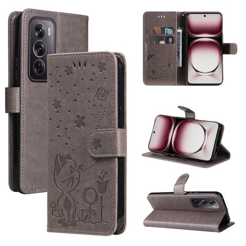 Para Oppo Reno12 Pro 5G Global Cat And Bee Funda de Cuero con Tapa En Relieve (Gris)
