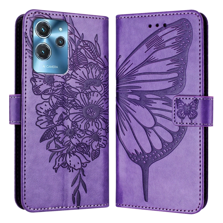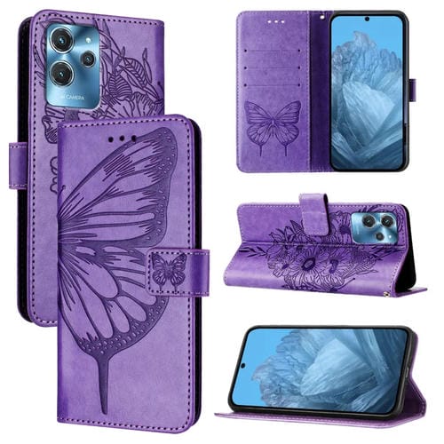 Funda de Cuero para Oukitel C32 con Mariposa en Relieve (Púrpura)