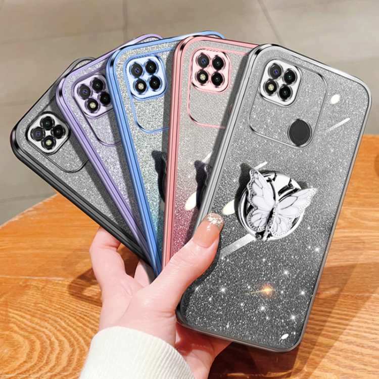 Para Redmi 9C / 10A Funda para Teléfono de TPU con Soporte de Mariposa con Brillo Degradado Plateado (Rosa)