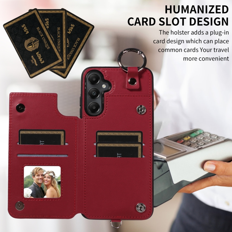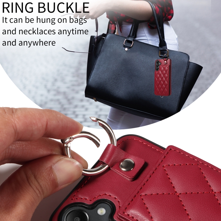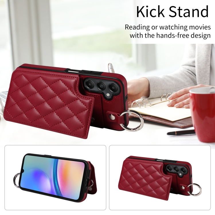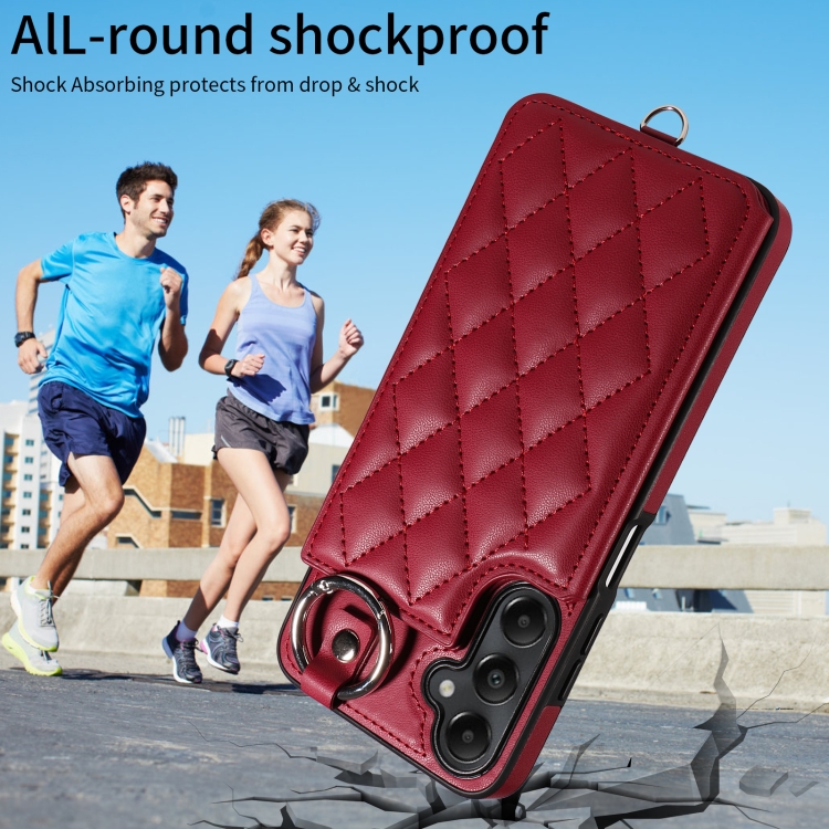 Estuche para Teléfono Samsung Galaxy A05S con Bolsa para Tarjetas Textura Rómbica y Cordón Corto (Rojo Vino)