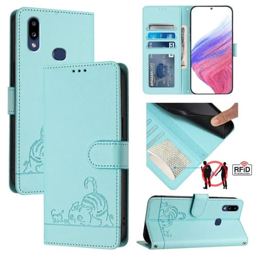 Estuche para Teléfono Samsung Galaxy A10S / M01S Cat Rat Cuero Rfid Patrón En Relieve con Cordón (Verde Menta)
