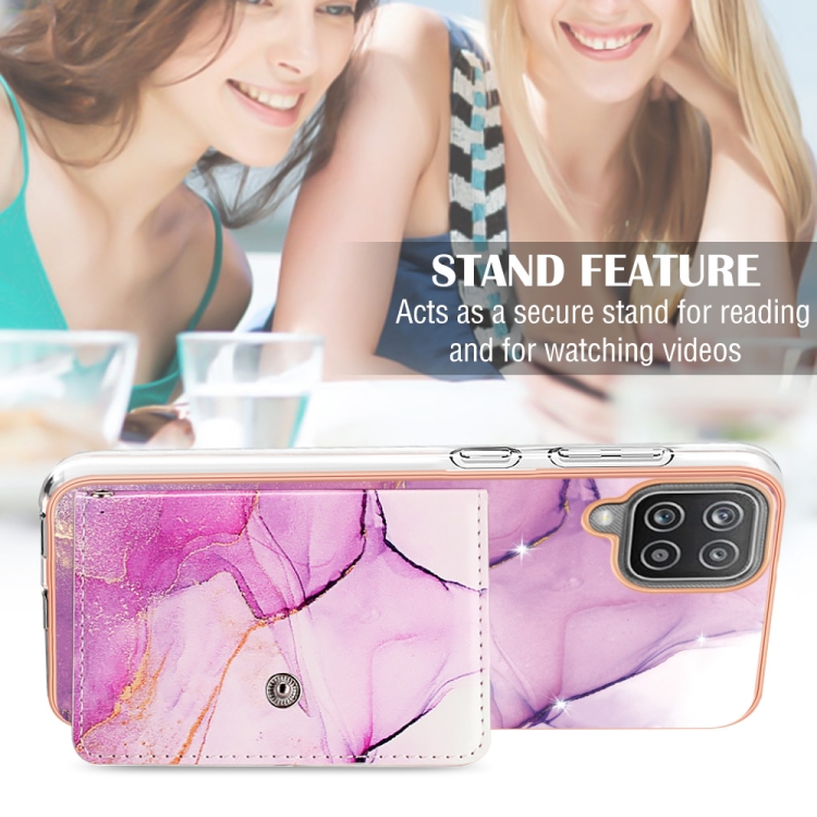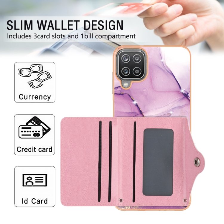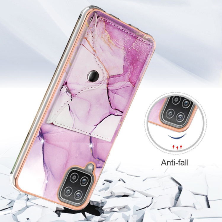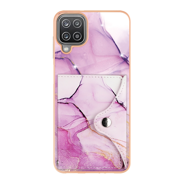 Estuche para Teléfono Samsung Galaxy A12 con Ranura para Tarjeta Imd y Patrón de Mármol (Oro Rosa Púrpura)