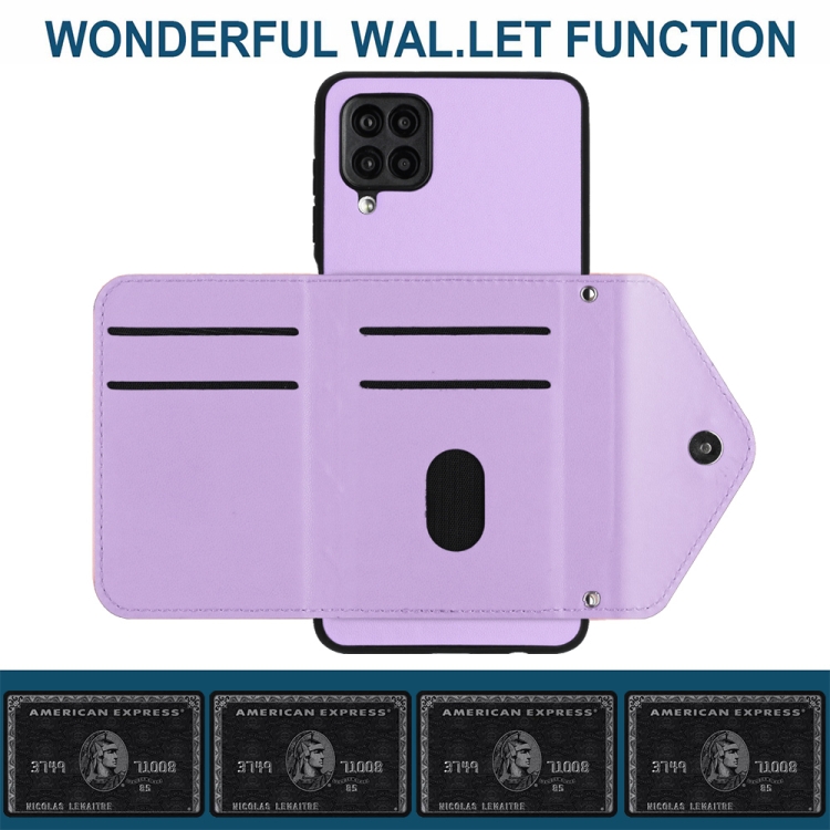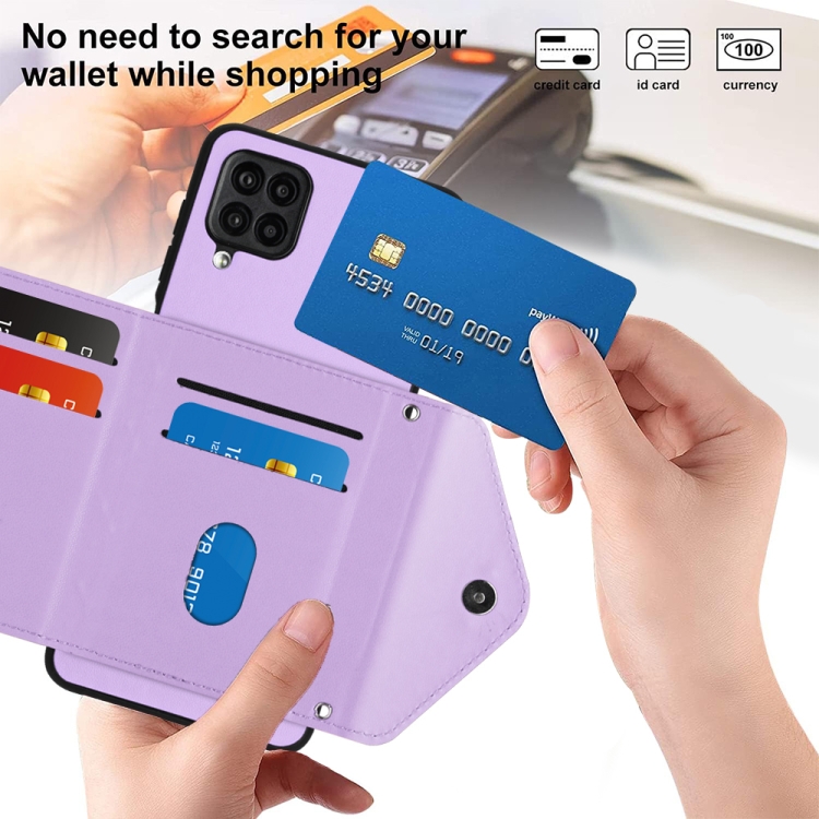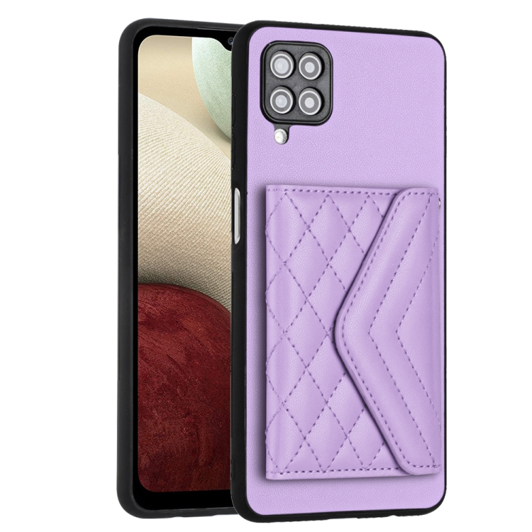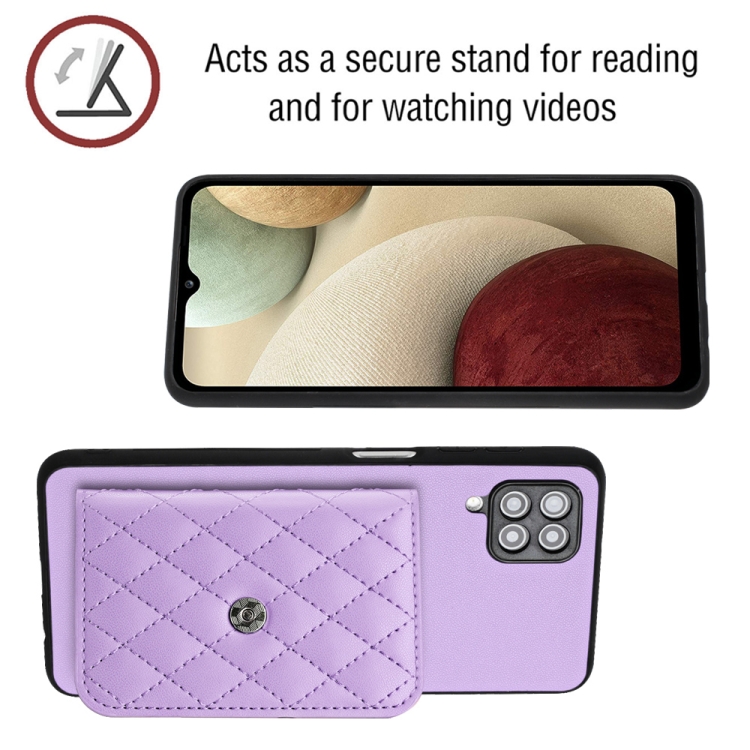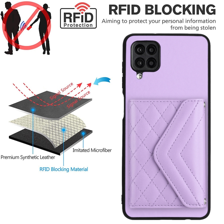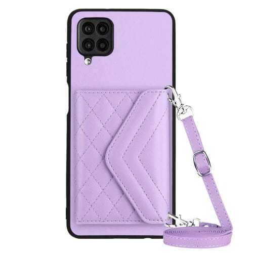 Estuche para Teléfono Samsung Galaxy A12 con RFID Bolsa para Tarjetas Textura Rómbica Cordón Largo (Púrpura Claro)