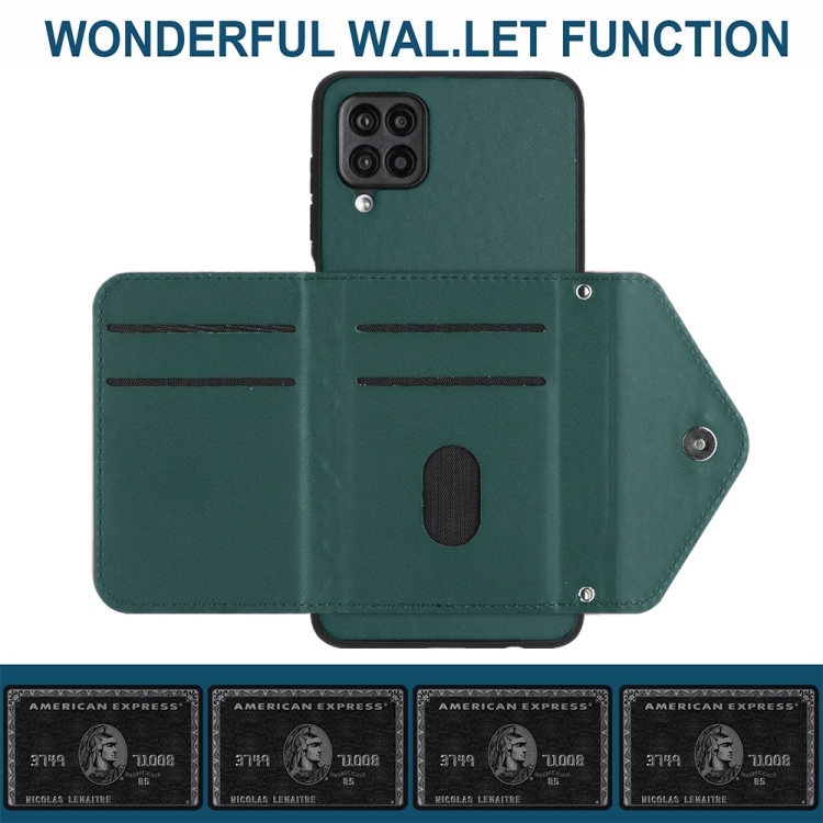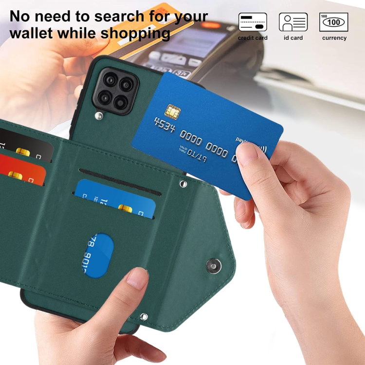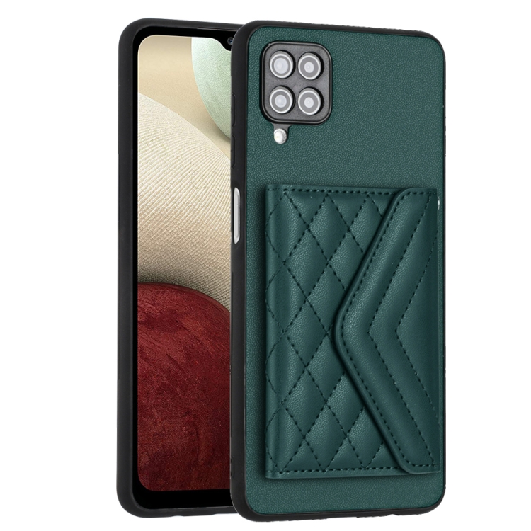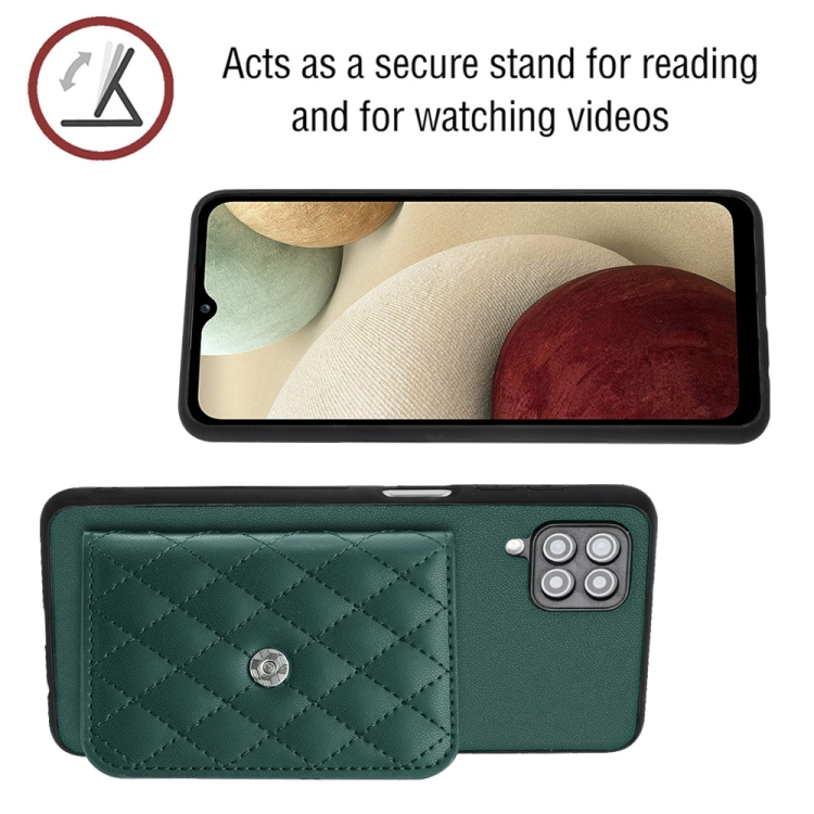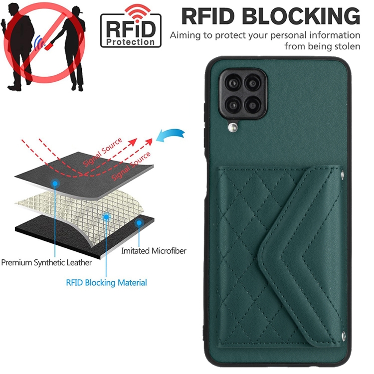 Estuche para Teléfono Samsung Galaxy A12 Rfid con Bolsa para Tarjetas Textura Rómbica Cordón Largo (Verde)