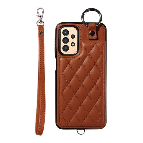 Estuche para teléfono Samsung Galaxy A13 4G y 5G con bolsa para tarjetas textura rómbica y cordón corto (Marrón)