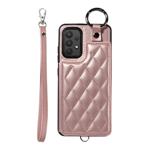 Estuche para Teléfono Samsung Galaxy A32 4G con Bolsa para Tarjetas Textura Rómbica y Cordón Corto (Oro Rosa)