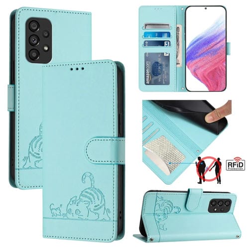 Estuche para Teléfono Samsung Galaxy A53 5G Cat Rat Cuero Rfid Patrón en Relieve con Cordón (Verde Menta)