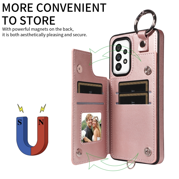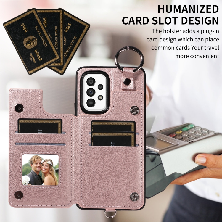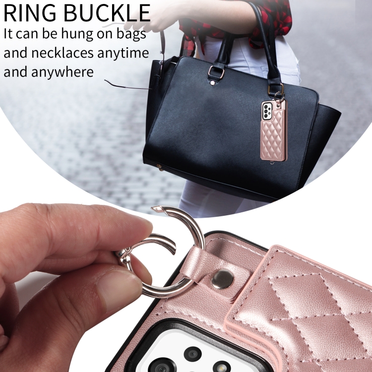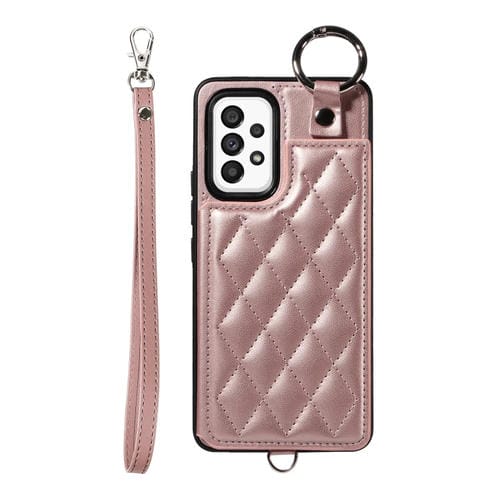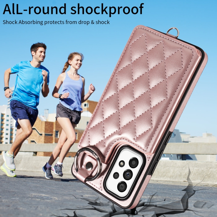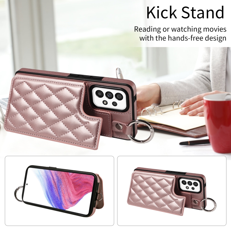 Estuche para Teléfono Samsung Galaxy A53 5G con Bolsa para Tarjetas Textura Rómbica y Cordón Corto (Oro Rosa)