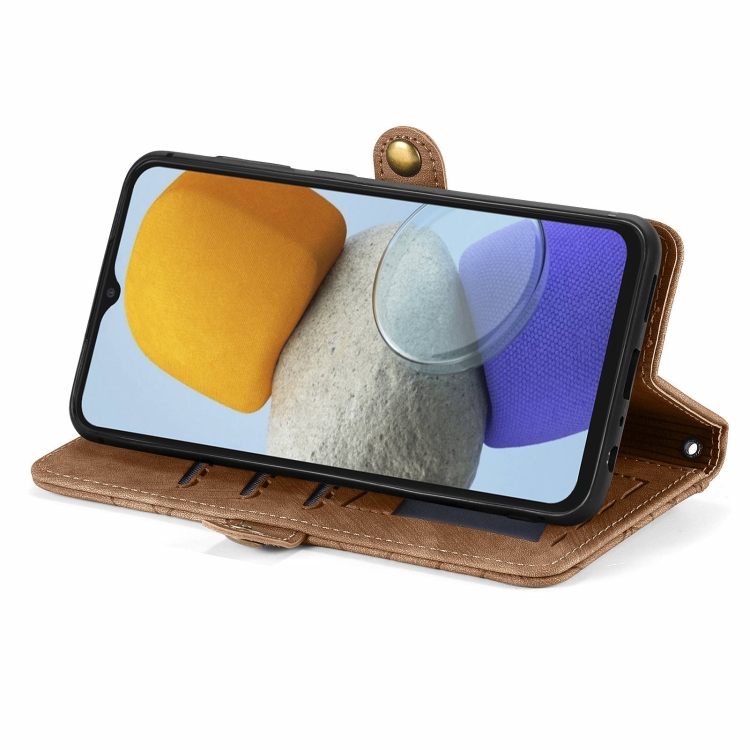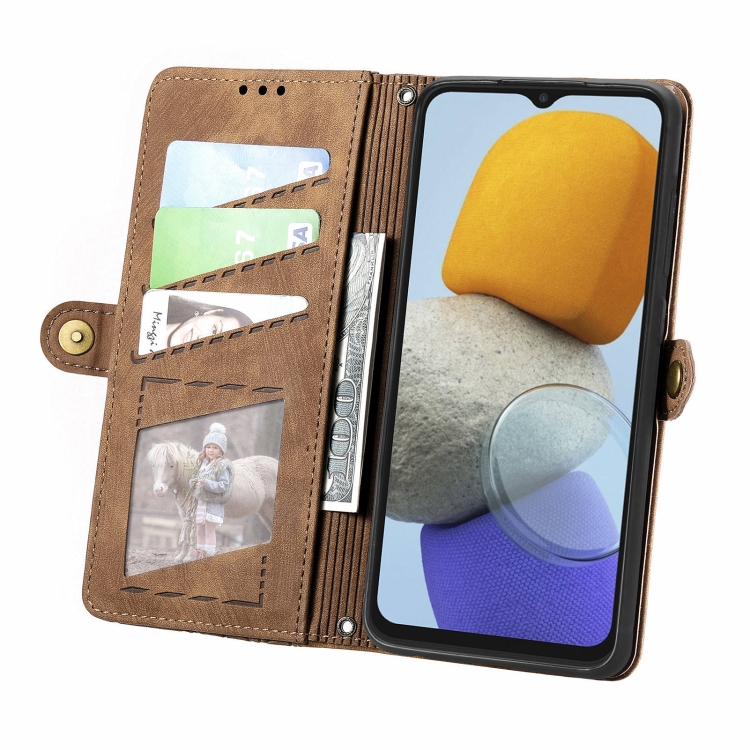 Estuche para Teléfono Samsung Galaxy M23 Cuero con Hebilla Lateral y Billetera con Cremallera Geométrica (Marrón)