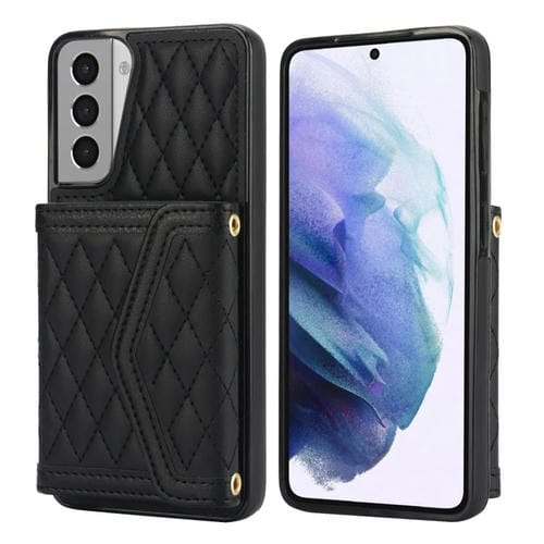 Estuche para Teléfono Samsung Galaxy S21+ 5G con Bolsa para Tarjetas Textura Rómbica y Cordón Largo (Negro)