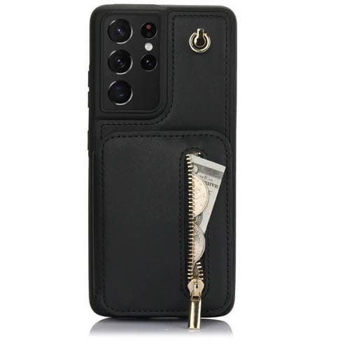Estuche para teléfono Samsung Galaxy S21 Ultra 5G Ym006 con bolsa para tarjetas, cremallera y cordón doble (Negro)