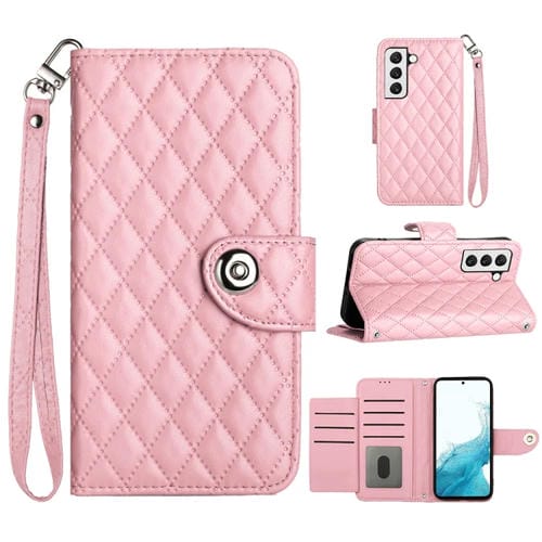 Funda para Teléfono Samsung Galaxy S22 + 5G con Tapa de Cuero Textura Romboidal y Cordón (Rosa)