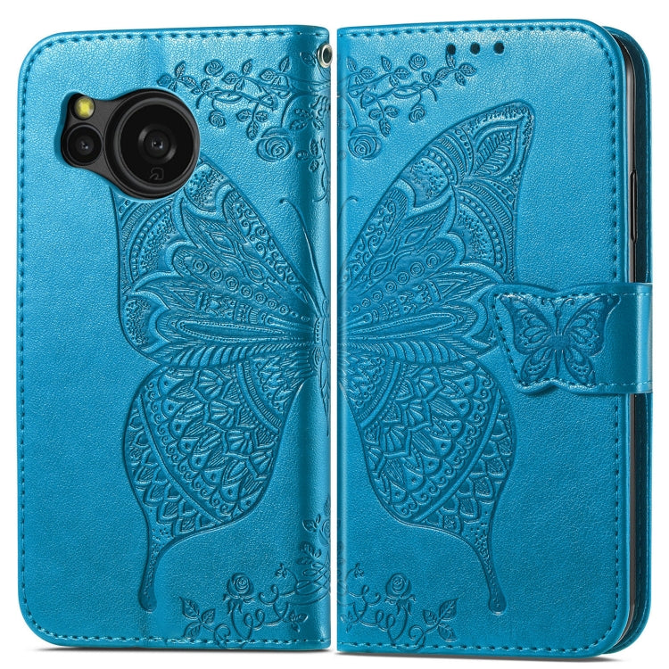 Funda para Sharp Aquos Sense8 de Cuero con Relieve Flor y Mariposa (Azul)