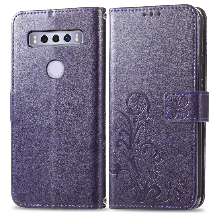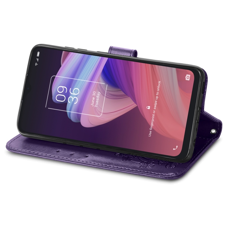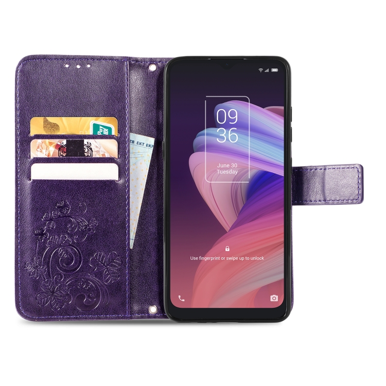 Funda de Cuero para TCL 10 Se con Cierre de Cuatro Hojas y Hebilla en Relieve (Púrpura)