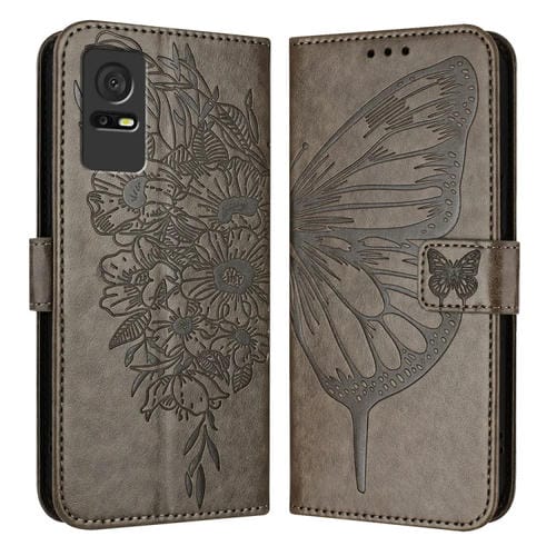 Funda de Cuero para Teléfono TCL 405/406/408 con Mariposa en Relieve (Gris)