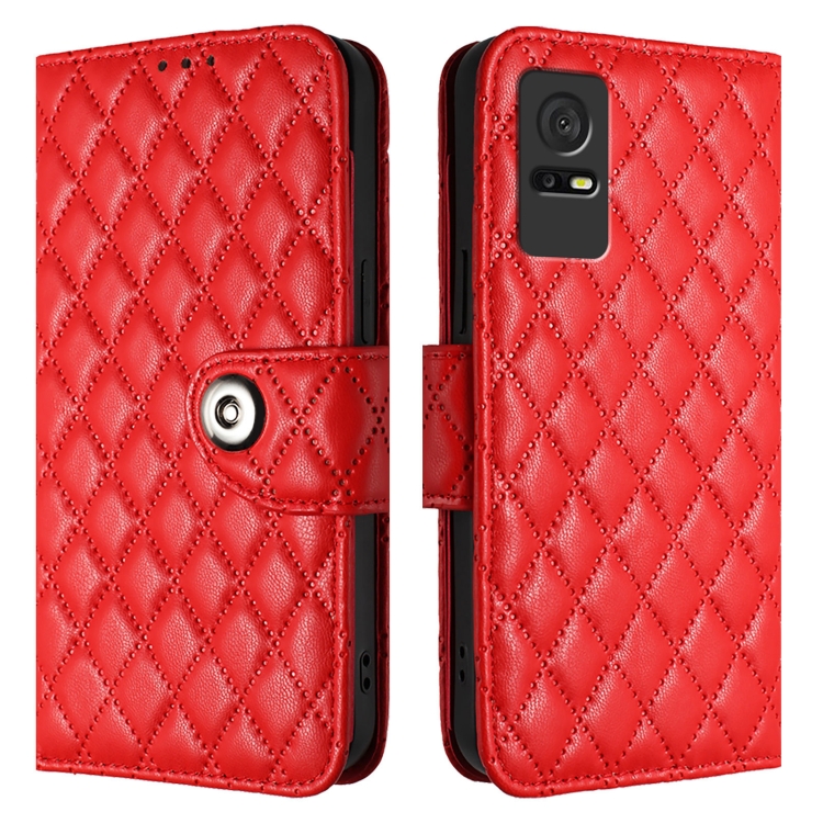 Funda para Teléfono TCL 405/406/408 Cuero con Tapa Textura Rómbica y Cordón (Rojo)