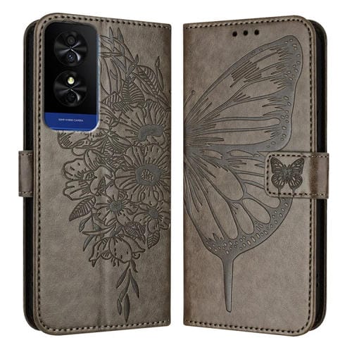 Funda de Cuero para TCL 50 5G con Mariposa en Relieve (Gris)