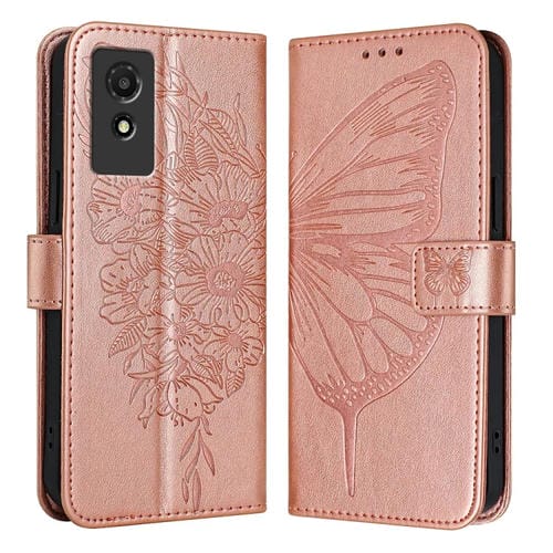 Funda de Cuero para TCL 501 con Mariposa en Relieve (Oro Rosa)