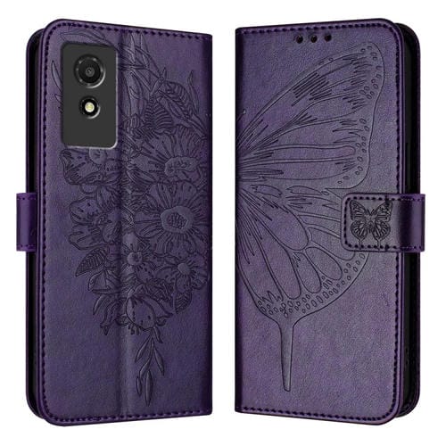 Funda de Cuero para TCL 501 con Mariposa en Relieve (Púrpura Oscuro)