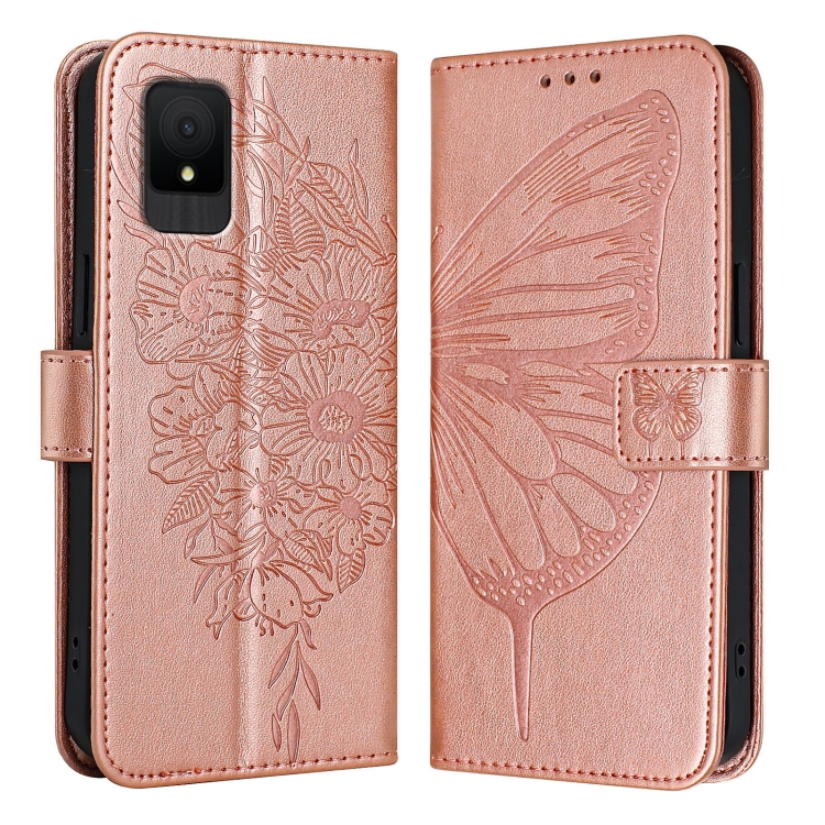 Funda de Cuero para TCL 502 con Mariposa en Relieve (Oro Rosa)