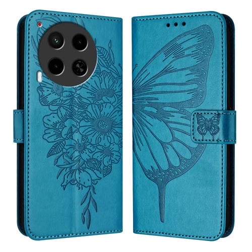 Funda de Cuero para Tecno Camon 30 4G y 5G con Mariposa en Relieve (Azul)