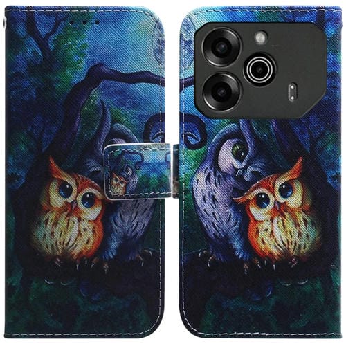 Funda de Cuero para Tecno Pova 6 Pro y Pova 6 con Tapa y Dibujo Coloreado Búho de Pintura al Óleo
