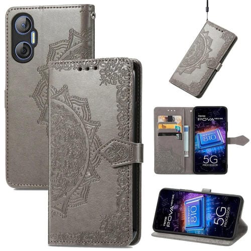 Funda de Cuero para Tecno Pova Neo 5G Mandala Flower en Relieve (Gris)