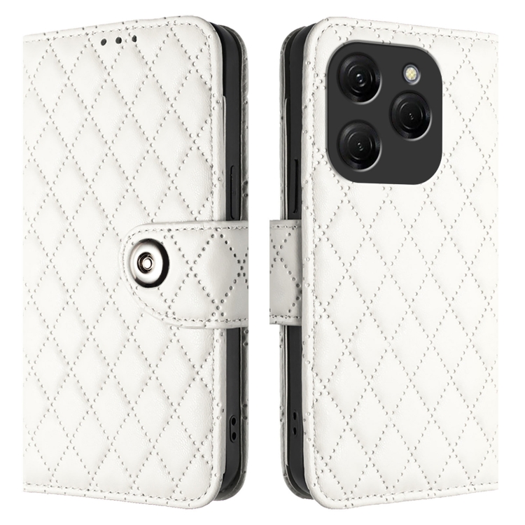 Funda de Cuero para Tecno Spark 20 Pro con Tapa Textura Rombal y Cordón (Blanco)