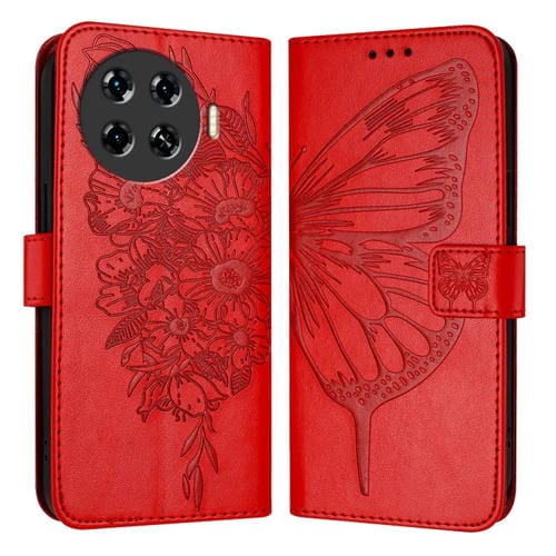 Funda de Cuero para Tecno Spark 20 Pro+ con Mariposa en Relieve (Rojo)